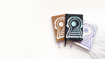 Three decorative Lunar Planners with celestial designs on a white surface with candles and crystals. 2026 Lunar Insights Planner