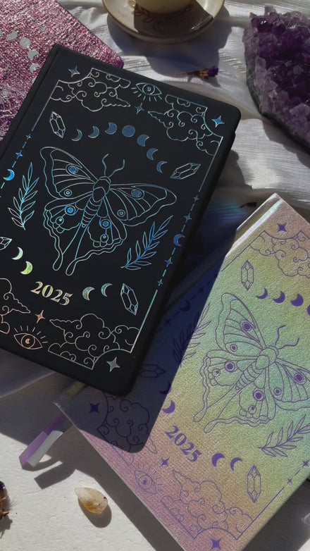 Synchronize your magical practice with lunar wisdom through our stunningly crafted 2025 planner. This isn't just a calendar – it's your personal grimoire for success. Available in three mesmerizing designs (Black Vegan Leather, Silver Rainbow Holographic, and Purple Holographic), each planner features: