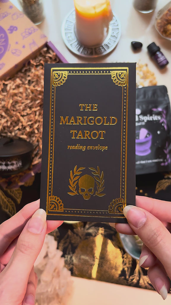 Each envelope carries 3 cards from The Marigold Tarot, a deck rooted in life, death, and gold. Receive “messages from beyond” by intuitively interpreting the images on each card and draw guidance from spirit and your ancestors.